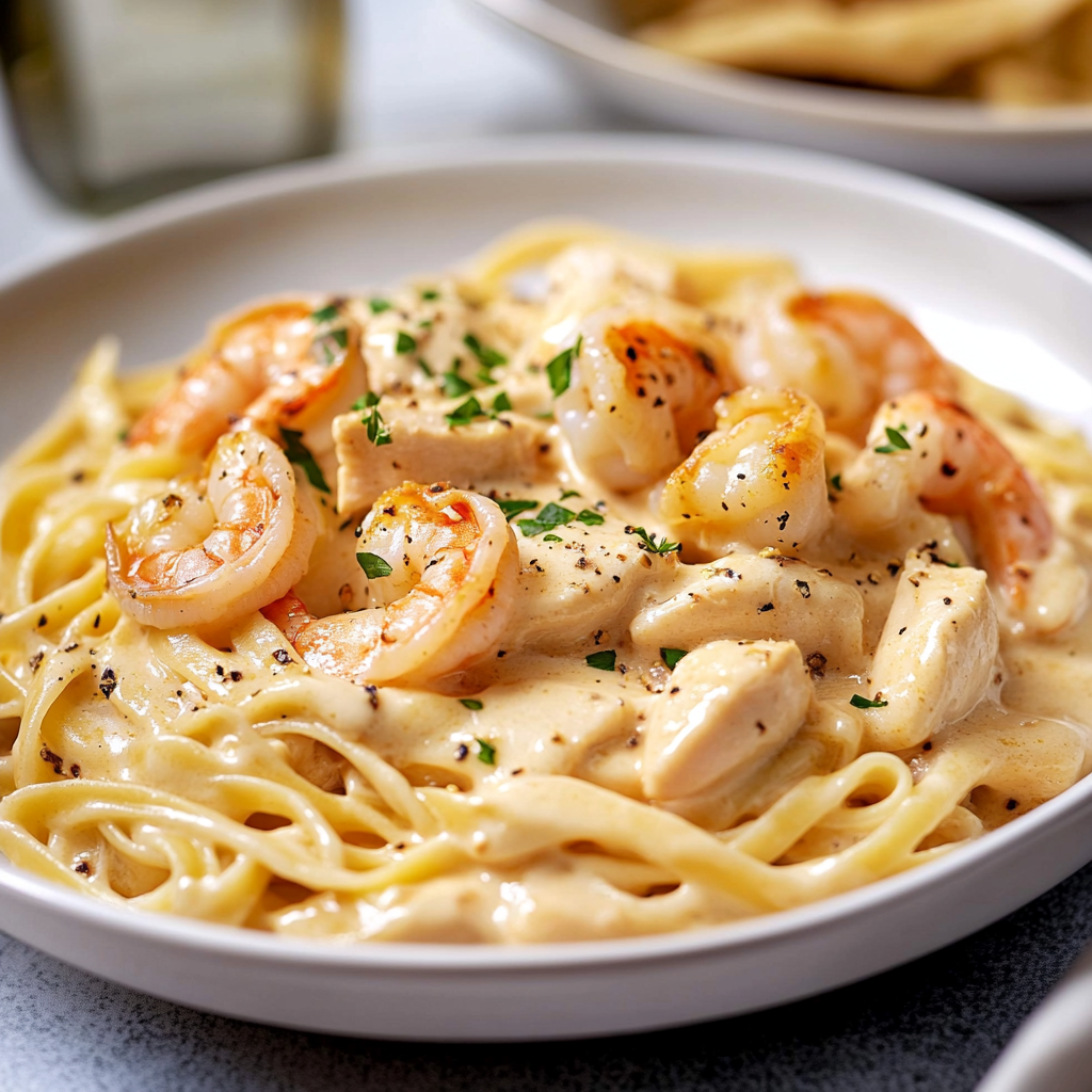 Chicken and shrimp alfredo is a luxurious pasta dish that transforms any weeknight dinner into a gourmet experience. This creamy, rich Alfredo sauce envelops perfectly cooked fettuccine, succulent shrimp, and tender chicken. With just a few key ingredients and simple steps, you can create a comforting meal that impresses family and friends alike. Get ready to savor each bite of this delightful dish that’s perfect for any occasion!
