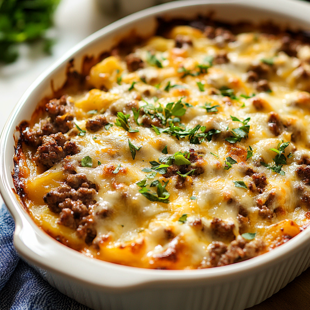 Start by browning the ground beef in a skillet, then layer that deliciousness with your potatoes and cheese in a baking dish. Bake until golden brown for maximum flavor.