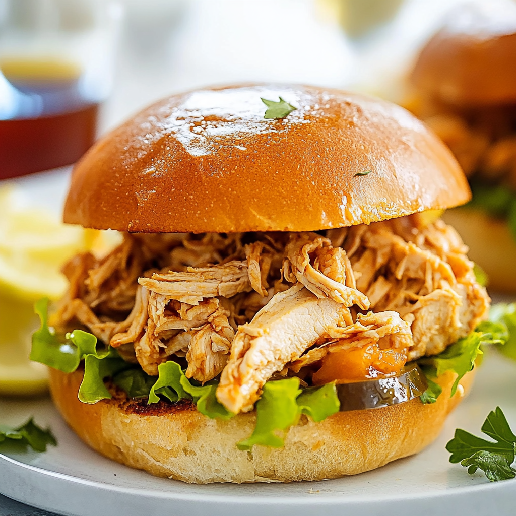 Savor the comfort of shredded chicken sandwiches, where tender chicken meets tangy BBQ sauce, all nestled in soft buns. This easy-to-make dish is perfect for busy weeknights or gatherings with friends. Enjoy customizing each sandwich with your favorite toppings for a delightful burst of flavor in every bite!